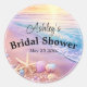 The Beach at Sunset Brautparty Classic Round Sticker Dieses Bild zeigt eine ruhige Strandszene bei Sonnenuntergang. Der Himmel ist mit lebhaften Farbtönen wie Rosa, lila und Orange bemalt, wie die Sets am Horizont, was einen fesselnden Verlauf erzeugt. Die sanften Wellen rollen über den Sandstrand, wo sich verschiedene Muscheln und Seesterne verstreut befinden. Muscheln und Seesterne sind in Pastellfarben gehalten, was die sanften Farbtöne des Sonnenuntergangs ergänzt. Dieser ruhige und malerische Augenblick ruft ein Gefühl der Entspannung und der Wertschätzung für die Schönheit der Natur hervor.