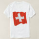 Dieser Entwurf ist eine Schweizer Flagge. Die Schweizer Flagge flattert im Wind. Dieser Schweizer Flaggenentwurf schaut auf dem diesem T - Shirt der Männer groß