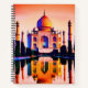 Journal in einer Illustration des Taj Mahal, reflektiert im Wasser, und unterstützt von einem tiefkorallenorangen Sonnenuntergang Himmel