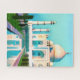 Puzzle in einer Illustration des Taj Mahal, reflektiert in einem Pool, unter einem aquamarinisch blauen Himmel