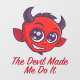 Vector Cartoon Illustration eines teuflisch niedlichen kleinen Teufels mit großen Augen mit The Devil Made Me Do It Text. Schlüsselwörter: Teufel, Hölle, niedlich, Dämon, Böse, Satan, Halloween, Monster, Hörner, Horror, bezaubernd, süß, teuflisch, teuflisch, wertvoll, liebenswert, liebenswert, reizend, anziehend, anziehend, reizvoll, lieblich, lieblich, lieblich, wütend, charmant, bezaubernd, hübsch, Adorbs