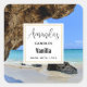 Kerzen, Seifen, Küchen oder andere handgearbeitete Aufkleber mit einem landschaftlichen Naturfoto. Schönes türkisblaues Meer mit einem Sandstrand. Ein großer, brauner Felsen verleiht dem hellblauen Himmel Schatten.