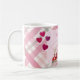 Diese niedliche, individuelle Valentinstag Kaffee-Tasse zeichnet sich durch ein rosa und rotes Aquarell-Design aus. Eine Abbildung eines kleinen Valentinstrennes mit Gnomen ist unten abgebildet. Das Bild wird von vielen Herzen betont. Die Grenze weist ein gesundes, rosa kariertes Muster auf.
