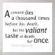 Die zeitlose Weisheit von Julius Cäsar von William Shakespeare wird in diesem kraftvollen Zitat lebendig: "Ein Feigling stirbt tausendmal vor seinem Tod, aber der tapfere Geschmack des Todes, aber einmal. Es scheint mir seltsam, dass Männer Angst haben sollten, denn sie sehen, dass der Tod, ein notwendiges Ende, kommen wird, wenn er kommt." Diese Worte des Mutes haben zahllose Soldaten, Mannschaften und Abenteurer inspiriert, mutige Schritte nach vorn zu unternehmen. Sie erinnern uns daran, dass ein Sieg nicht ohne Tapferkeit erreicht werden kann und dass das Leben in Angst nur zu tausend kleinen Niederlagen führt. Diese Botschaft hallt jenseits ihres ursprünglichen Kontextes und widerspricht den Lehren Jesu: "Wer sein Leben Liebe, verliert es, und wer auch immer sein Leben in dieser Welt hasst, wird es für ewiges Leben behalten." Wahrer Mut bedeutet, das Richtige über den persönlichen Komfort zu bewerten und die Kraft zu finden, selbstlos und mutig im Angesicht der Angst zu handeln. Ob als Inspiration für sich selbst oder als Ermutigung für jemanden, den Sie interessieren, lass dieses Zitat als Erinnerung, tapfer zu leben, Tapferkeit über Angst zu wählen und die größeren Belohnungen anzunehmen, die aus dem Richtigen entstehen.