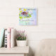 Ein nobler und eleganter Einklebebuch-Fotorahmen für diesen neuen Babyjungen oder -mädchen eingesäumt durch gelbe Vögel, gelbe Schmetterlinge, blaue und weiße Blumen und ein blaues Band alle auf einem splotchy hellen blauen lila grünen und weißen Watercolorpastellhintergrund. An der Spitze in der großen dekorativen Beschriftung ist der Name des Kindes und entlang der Unterseite die Zeit und das Geburtsdatum, zusammen mit dem Geburtsnotfall, dem Länge des Kindes und Gewicht an der Geburt. Eine große Geschenkidee und ein perfektes Andenken für dieses neue Baby oder Mädchen.