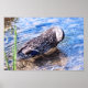 Eine Mallard Hen befindet sich in der flachen Zone eines Teiches, der ihre Federn anregt und in einer kreisförmigen Bewegung die Wellen über die Oberfläche des Teiches bewegt. Sie können die Reflektion von Wolken auf der Oberfläche des Teiches sehen. Und man kann durch das saubere, klare Wasser sehen. Copyright Kimberly J Tilley.