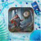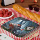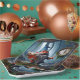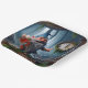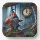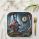 Ein glücklicher Gnome steht in einem Wald, der eine Tasse Bier hält und auf eine große rustikale Uhr zeigt, die inmitten der Bäume hängt, die fünf Uhr lesen.