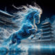 Ein Pferd, das aus Wasser in einer fantastischen und dynamischen japanischen Landschaft besteht, kann seinen Kaffee genießen.
