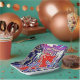 Fügen Sie Ihrem Leben etwas Optimismus hinzu, in Form dieses hellorangen, blauen Retro-futuristischen Musters. Die Zukunft beginnt heute.