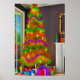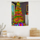 Ein geschmückter Weihnachtsbaum im Wohnzimmer mit vielen Weihnachtsgeschenken unter dem Baum. Das ist eine künstlerische KI.