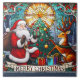 Ein fröhlicher Weihnachtsmann schenkt einem freundlichen Rentier neben einem wunderschön dekorierten Weihnachtsbaum, umgeben von farbenfrohen Geschenken und lebendigem Buntglas.