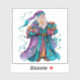 Eine fröhliche Figur mit lebhaften violetten und blauen Roben, die mit aufwändigen Designs geschmückt ist, hält farbenfrohe Geschenke mit Bögen. Die festliche Atmosphäre wird durch schwirbelnde Bänder und funkelnde Ornamente, die den fröhlichen Geist der Weihnachtszeit verkörpern, noch verstärkt.