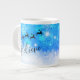 Weihnachts-Jumbo-Tasse mit einer schwarzen Silhouette des Weihnachtsmannes, der in seinem Schlitten von seinen Rentieren, die über den Himmel fliegen, gezogen wird. Glauben Sie, in einem trendigen Skript-Schriftart geschrieben. Der Hintergrund ist ein eisblau frostiges Schneeflockendesign.