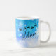 Weihnachts-Tasse mit einer schwarzen Silhouette des Weihnachtsmannes, der in seinem Schlitten von seinen Rentieren, die über den Himmel fliegen, gezogen wird. Glauben Sie, in einem trendigen Skript-Schriftart geschrieben. Der Hintergrund ist ein eisblau frostiges Schneeflockendesign.