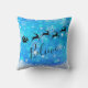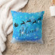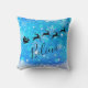 Weihnachtskissen mit einer schwarzen Silhouette des Santa-Reitens in seinem Schlitten, der von seinen Rentieren über den Himmel gezogen wird. Glauben Sie, in einem trendigen Skript-Schriftart geschrieben. Der Hintergrund ist ein eisblau frostiges Schneeflockendesign.
