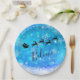 Weihnachtspapiere Teller mit einer schwarzen Silhouette des Weihnachtsmannes, der in seinem Schlitten von seinen Rentieren, die über den Himmel fliegen, gezogen wird. Glauben Sie, in einem trendigen Skript-Schriftart geschrieben. Der Hintergrund ist ein eisblau frostiges Schneeflockendesign.