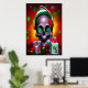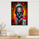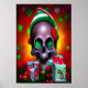 Ein Schädel mit einer grünen Weihnachtsmütze auf einem roten, gelben, grünen Hintergrund und Weihnachten vor dem Schädel. Das ist eine künstlerische KI.