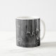 Ein Schwarz-Weiß-Foto von bestens sortierten Werkzeugen, die von einem Holzbrett in einer Werkstatt hängen.