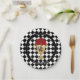 Party paper plates - in 2 sizes - feature a gold trophy filled with red roses on a black and white check background with your names and date in chic lettering.