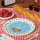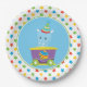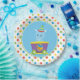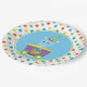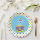 Diese Partyplatte kennzeichnet einen blauen Hintergrund, der durch einen wiederholenden Rüttler der roten, blauen, gelben und grünen Sterne umgeben wird. Ein niedliches Babyflusspferd (Hippopotamus) einen Partyhut in einem lila Zugauto tragend sitzt mitten in der Platte.