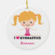 Niedliche personalisierte Verzierung für die Gymnasts, die ein kleines Cartoonmädchen mit dem blonden Haar tut sidesplits kennzeichnen. Unter ihr ist der Text "ich Gymnastik der Liebe (Herz)". Addieren Sie einen Ihren Namen oder anderen Text. Spaßentwurf für Mädchen.
