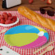 Dieses Ausrüstungsbeschreibungen ein großer runder Wasserball mit den rosa, gelben, blauen und grünen Abschnitten.