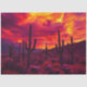 Desert cactus sunset artwork featuring towering saguaro cacti silhouetted against a dramatic red and orange sky. A lightning strike illuminates the desert landscape while glowing sunset clouds and desert vegetation create a bold southwestern scene.
