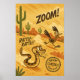 Ein lustiger und nostalgischer Comic-Druck mit einer klassischen Wüstenjagd zwischen einem schnellen Straßenläufer und einer gekochten Klapperschlange. Dieses spielerische Design mit kräftigen Retrofarben und stilisierten Kakteen ist perfekt für Fans Vintager Wildtierkunst und südwestlicher Flair.