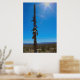 A striking view of a weathered roadside art pole covered in found objects under a bright Mojave Desert sun. The intense blue sky and sun flare create a bold, minimalist desert scene perfect for modern or eclectic wall decor.