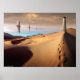Foto Collage Komposition mit einer surrealen Wüstenlandschaft. Große Sanddünen, Fußspuren zu einem Wachturm und schwimmende Inseln sind im Hintergrund zu sehen.