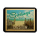 Dieses Greetings From Destin Vintage Postcard Design verfügt über einen Sandstrand mit einem schönen türkisfarbenen Ozean Wasser und über dem Meer, einem blauen Himmel mit billigen weißen Wolken. Im Vintage Reisen Stil.