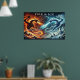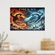 Das Schicksal von Feuer und Eis ist in dieser epischen Fantasy-Szene mit zwei mythischen Drachen verwoben. Der Feuerdrache, die Schuppen leuchten wie geschmolzene Lava, stürzt durch einen feurigen Himmel, Flammen, die um ihn herumwirbeln. Der in Blau- und Weißtönen schimmernde Eisdrache kommt aus einer gefrorenen Landschaft, die einen kühlen Nebel ausstrahlt. Der Hintergrund ist ein auffallender Kontrast zwischen den feurigen und eisigen Elementen. "FIRE & ICE" wird oben angezeigt