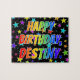 Dieses aufregende und lustige Jigsaw-Puzzle-Design hat die Botschaft "HAPPY BIRTHDAY, DESTINY" mit den Buchstaben, die ein farbenprächtiges Regenbogenspektrum haben, inspiriertes Farbverlaufsmuster, zusätzlich zu einem lebendigen Sternenhintergrundmuster. Ein farbenfrohes Rätsel wie dieses könnte eine lustige Art sein, Geburtstagswünsche an jemanden namens Destiny zu senden. [~Z0000468]
