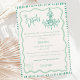 Diese trendige, handgezeichnete, illustrierte Hochzeitsdetails Gehäuse-Karte verfügt über einen Schreiber-Bogen und Kronleuchter. Das skurrile und sonderbare Design beinhaltet handgeschriebenen Schriftart und Festdoodles. Weiche grüne Farbe für klassische und moderne Hochzeitsfestung.