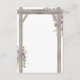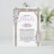 Hübsche Hochzeitsausweise mit elegantem, weißem Hintergrund, der in jede beliebige Farbe verändert werden kann, eine stilvolle lila und lavendelfarbene Aquarelldarstellung auf einem rustikalen hölzernen Hochzeitsbogen, ein geschnitztes Herz mit den Paarinitialen und eine Hochzeitsvorlage.