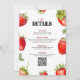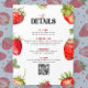 Dieses niedliche Baby Dusche Party Details Design verfügt über einen bezaubernden roten Erdbeerrahmen auf einem Weiß mit individualisierbarer schwarzer Typografie.