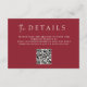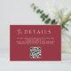 Eine schlichte und elegante Hochzeitsdetails-Kapselkarte mit zeitgenössischem Stil und einem raffinierten Look in Cranberry rot mit Elfenbeintext. Es verfügt über ein attraktives minimalistisches Layout, stilvolle elegante Typografie, einen QR-Code, um mit Ihrer Hochzeitswebsite zu personalisieren, um die Gäste mit allen Details und UAWG zu verbinden. Zusätzlich verfügt die Rückseite der Karte über eine Vorlage, um mit den Monogramm-Initialen der Braut und des Bräutigams und den Sets den perfekten Ton für Ihre Feier zu personalisieren. Passen Sie Ihre Wunschdaten und Ihre Monogramm-Initialen an.