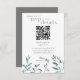 Diese einfache, moderne Gartengrün Hochzeit RSVP und Details Karte mit QR-Code verfügt über eine Aquarellblume, feucht/Libelle in Blau-und Grün-Schattierungen mit leuchtenden Flügeln. Es befindet sich in einer einfachen Anordnung von Grünpflanzen in den Farben Grün, Blau, Grau und Braun mit weißem Hintergrund. Die Rückseite ist ein solides Grau, das dem Text entspricht. Fügen Sie einfach Ihre Hochzeitswebsite-URL hinzu, damit Ihre Gäste den QR-Code einsehen können und einfach antworten und alle Ihre Hochzeitsdetails einsehen können.