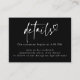 Diese Karte ist für das moderne Paar konzipiert, das sowohl Eleganz als auch Leichtigkeit schätzt. Set vor schwarzem Hintergrund, fett weißer Text gepaart mit einem fließenden handgeschriebenen Skript, fertig mit einem zarten Herz für eine romantische Touch. Diese kleine Hochzeitsinformationskarte passt perfekt zu minimalistischen Themen, schwarzer Krawatte oder zeitgenössischen Hochzeitsthemen und verleiht Ihrer Einladungssuite modernen Funktionalität und Charme