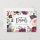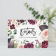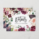 Rosa, Bordeaux und Feigenfarbe Blumenzwiebelausweis Einladung Details Karte. Wasserfarbene Blumen, Blattwerk und handgemalte Früchte. Teil einer Hochzeitssuite. Die Hintergrundfarbe kann angepasst werden.