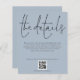 Eine günstige BUDGET-Alternative für eine kleinere Größe von 4,5 x 5,6 Zoll, die ein Gewicht von 110 lbs hat, die ähnlich dick ist wie eine Postkarte (sie ist jedoch nicht als Postkarte geeignet). BITTE BEACHTEN SIE, DASS ES EINE Einladung pro Blatt gibt. Hochzeitsdetails QR Code Skript Dusty Blue. Lass deinen Gästen Informationen wie Anfahrtsbeschreibung und Unterkunftsinformationen für deine Hochzeit, wenn du ihre Einladungen versenden kannst. Dieses elegante Design hat Set stilvolle große Typografie für den Titel The Details und die Erholung des Textes können leicht personalisiert werden, um Ihre Worte zusammen mit Ihrer Website QR-Code. Sie können jede beliebige Farbe für Text- und Hintergrundfarben auf beiden Seiten über die weitere Option anpassen.