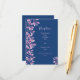 Eine elegante, blumengeschmückte Hochzeitsempfehlung in Blau und Rosa. Ein trendiger, blauer Hintergrund auf der Vorderseite. Dekoriert mit botanisch rosa, wasserfarbenen Krähen und Blättern. Vorlagen für Ihre Hochzeitsempfangsdetails, rosa Text. Zurück: blauer Hintergrund. Ideal für einen Herbst, eine Winterhochzeit.