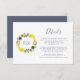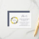 Dieses Hochzeitsdesign zeigt die Monogramm-Initialen des Paares in Grau, gerahmt durch einen Aquarellkranz aus gelben Frühlingsblumen und Blattwerk auf der links Seite. Das Wort "Details" erscheint in elegantem Grauhandschriftskript, mit den Einzelheiten der Hochzeit unten. Die Rückseite ist massiv grau.