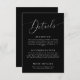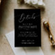 Elegante und minimale Einladungs-Karte mit modernem Skripttext oben auf schwarzem Hintergrund. Passen Sie diese Einladung an, indem Sie Informationen über Ihre Hochzeit, einschließlich Empfang, Unterkunft und Website. Ideal für jede Jahreszeit.