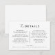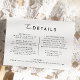 Das Design unserer White Modern Script Wedding Details Enclosure Card, in der modernes Minimalismus auf die Kunst der Kalligraphie trifft. Diese kuratierte Ästhetik bringt einen Hauch von Raffinesse zu Ihrem besonderen Tag - mit einer Drehung von boho, lässigem Charme. Die Kombination aus einfacher Typografie und einem stilvollen Script-Schriftart verleiht Ihrer Hochzeit eine einzigartige Persönlichkeit. Dieses klassische Design bietet einen zeitlosen, polierten Look, der perfekt für Frühjahr-, Sommer-, Herbst- oder Winterhochzeiten ist. Eine schlichte Farbpalette aus Schwarz und Weiß schafft die perfekte neutrale Kulisse für Ihre Feier. Machen Sie Ihre Hochzeit wirklich elegant mit unserer schönen, modernen Skriptkollektion. Wie bei allen unseren Designs, wenn Sie Fragen oder besondere Wünsche haben, frag einfach.