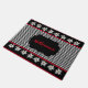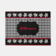 Deutsch inspirierte Türmatte in Schwarzweiß-Karo, mit roten Akzenten und Grafiken von Edelweiss Blume. Roter, benutzerdefinierter Text, in der Mitte der Matte, liest Welcome in German, Willkommen, und kann geändert werden, um zu lesen, was Sie gewollt haben.