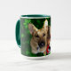 Deutsche Schäferspielzeug Rentier Grüne Schneeflocken Tasse. Kombo Zweifarbige Tasse mit Hundeschildern. Der grüne Schneeflockhintergrund macht diesen zauberhaften Hund und Spielzeug wirklich zum Pop. Ich wünsche Euch ein Hundeschlitten Frohe Weihnachten mit diesem deutschen Schäferhund und Spielzeugrentier. Das ist mein süßer deutscher Hirte namens Buddy.