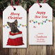 Auf der Vorderseite dieses Holiday Geschenketiketts befindet sich ein Bild eines bezaubernden deutschen Schäferhirten-Welpen in einem rot-weißen Weihnachtsgeschenksack. Hinter dem Hund befindet sich eine Reihe farbenfroher Urlaubslichter. Im Text oben steht "Frohe Weihnachten". Die Rückseite des Tags wiederholt das Bild der Holiday-Lichter, mit Textfeldern in rot, die Sie anpassen können.