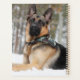 Deutscher Schäferhund posiert im Schnee mit einem Camoflaug farbenen Bandana.