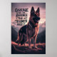 Ein deutscher Schäferhund steht stolz auf einem felsigen Berggipfel, auf dem ein motivierend Zitat über den Mut dahinter zu sehen ist. Die untergehende Sonne strahlt ein warmes Licht auf die Szene und schafft ein Gefühl von Hoffnung und Entschlossenheit.